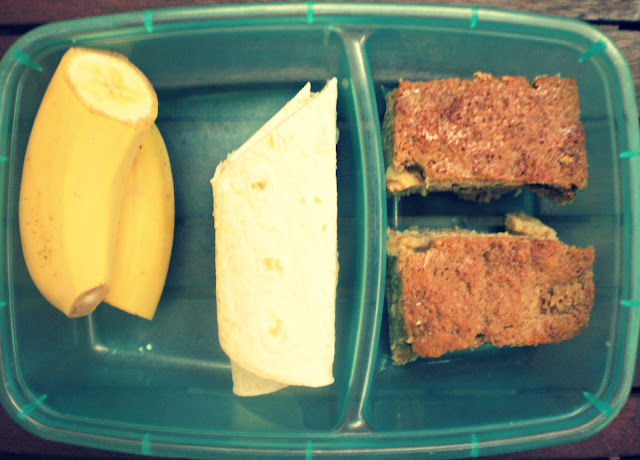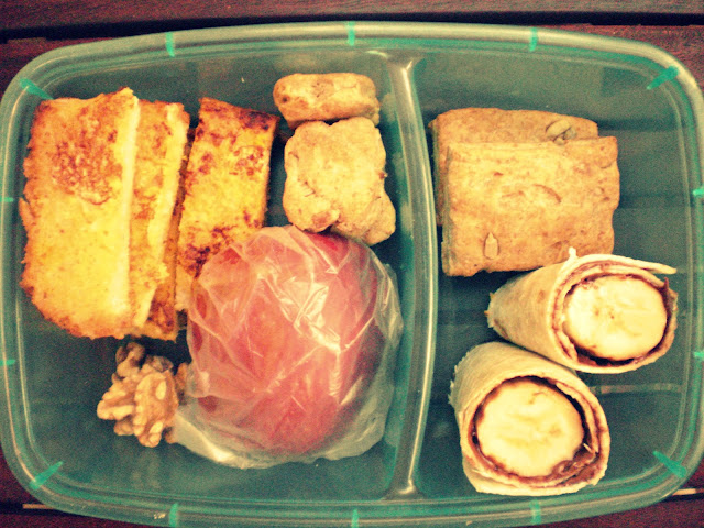 krekeri od integralnog brašna, rolovane tortilja sa bananom i Nutellom, pola jabuke i par oraha)