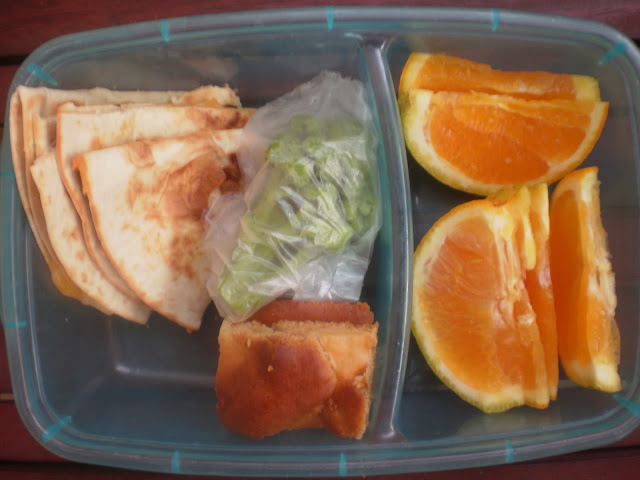 {kesadilja sa kačkavaljem (quesadilla), kolač od jabuke, pomorandža na kriške i brokoli na pari u kesici}