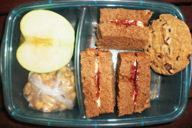 {sendviči od integralnog hleba sa puterom i domaćim džemom, cookie, indijski orah (u kesici) i pola zelene jabuke}