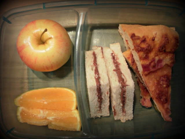 (Pdomaća pica od prethodne večeri, keksići od čokolade i cerealija, slani keksići sa susamom, pola jabuke i grožđe)